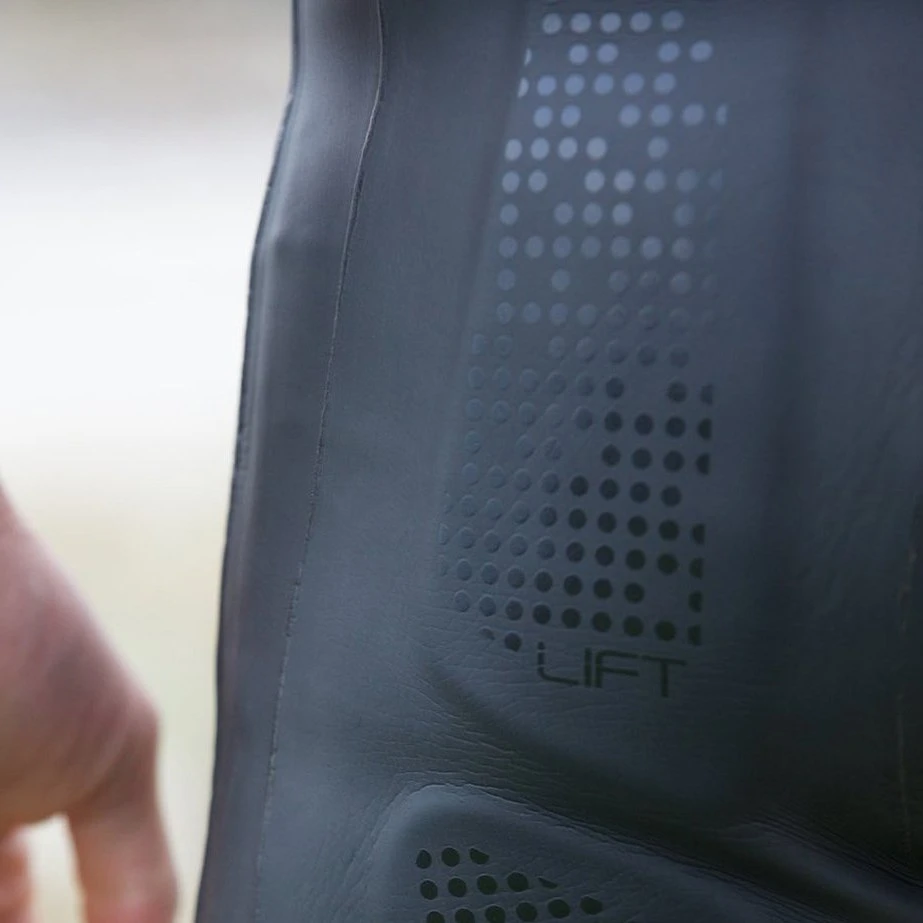 Geslachtsspecifieke contouren en dunnere, flexibelere zijpanelen van 3 mm hebben minder drijfvermogen, waardoor natuurlijke heuprotatie en gemakkelijker verwijderen van het pak mogelijk zijn.