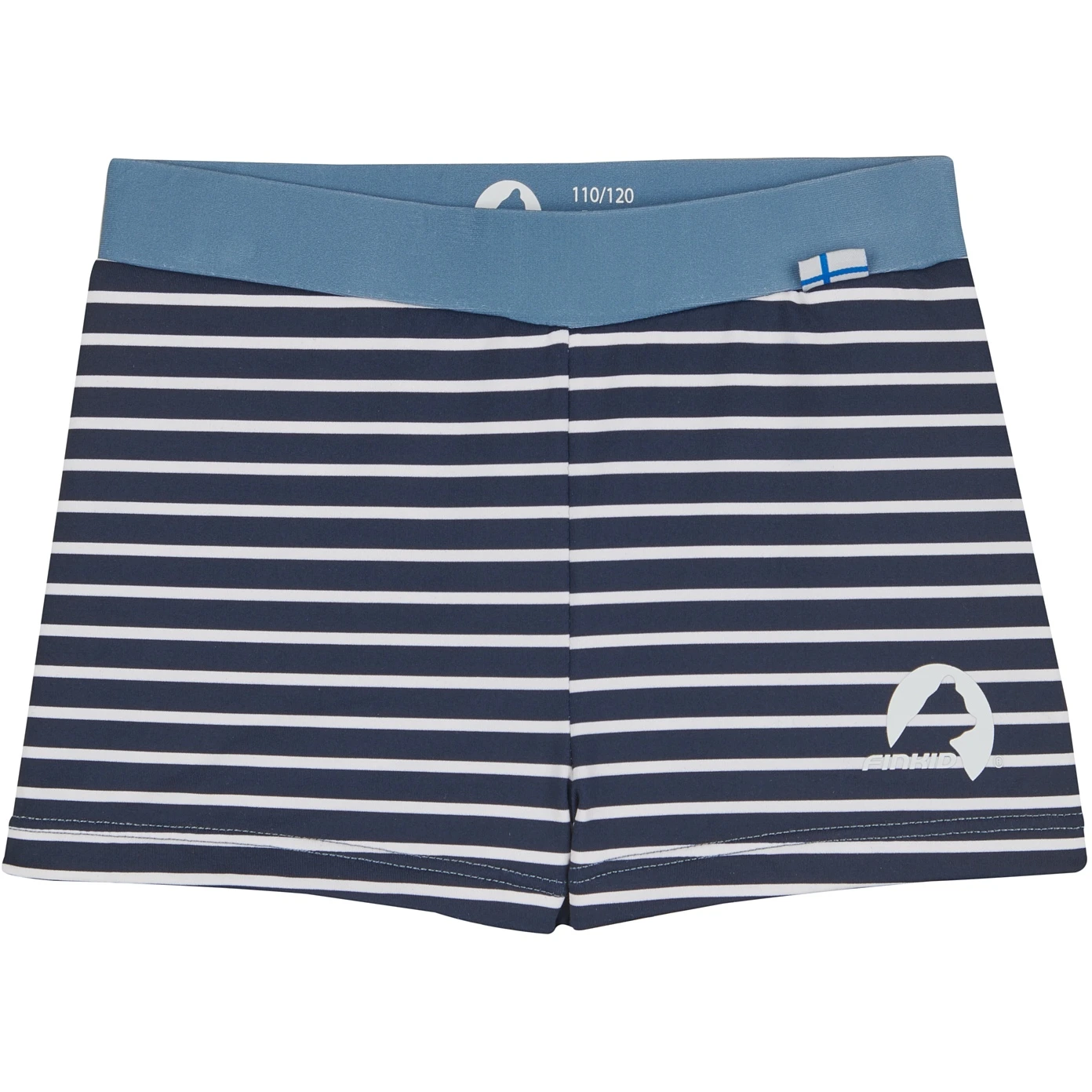 Een brede, mooi contrasterende tailleband, de sneldrogende stof, het nautische patroon: de UINTI zwemshort van Finkid zit gewoon goed en wil meteen mee naar het strand of het meer.