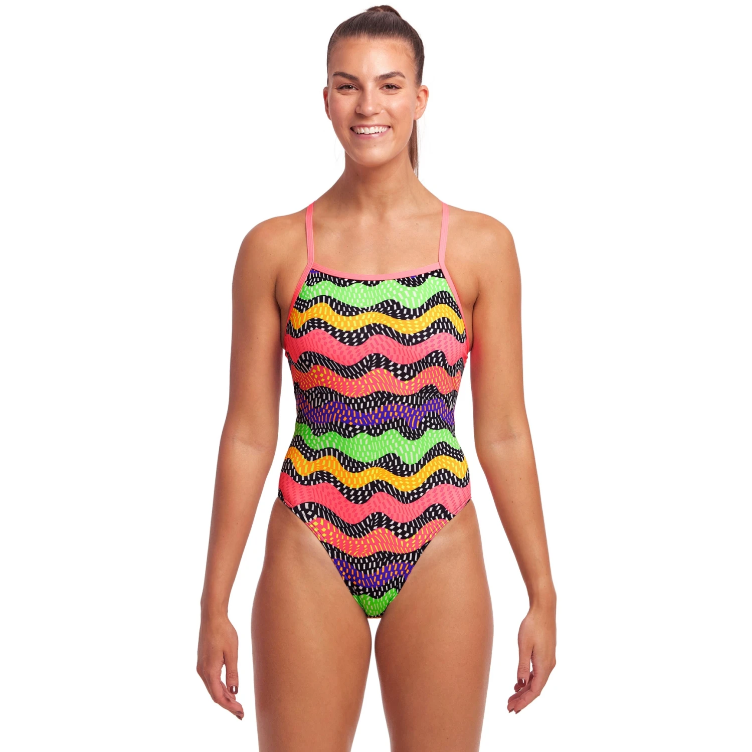 Bind het vast, bind het vast, bind het vast zoals je wilt! De individuele bandjes kunnen aan de achterkant worden geknoopt om u de perfecte pasvorm te geven voor uw volgende sessie. Als je lang en lang bent, kun je het losjes knopen om de schouderbandjes langer te maken, of als je kort en schattig bent, kun je het strakker knopen om het meer aan te trekken. Het Funkita Tie Me Tight zwempak heeft een hogere been- en bodemsnit dan de Funkita Diamond Back en Single Strap zwempakken, maar het houdt je nog steeds bedekt tijdens je sessie.
