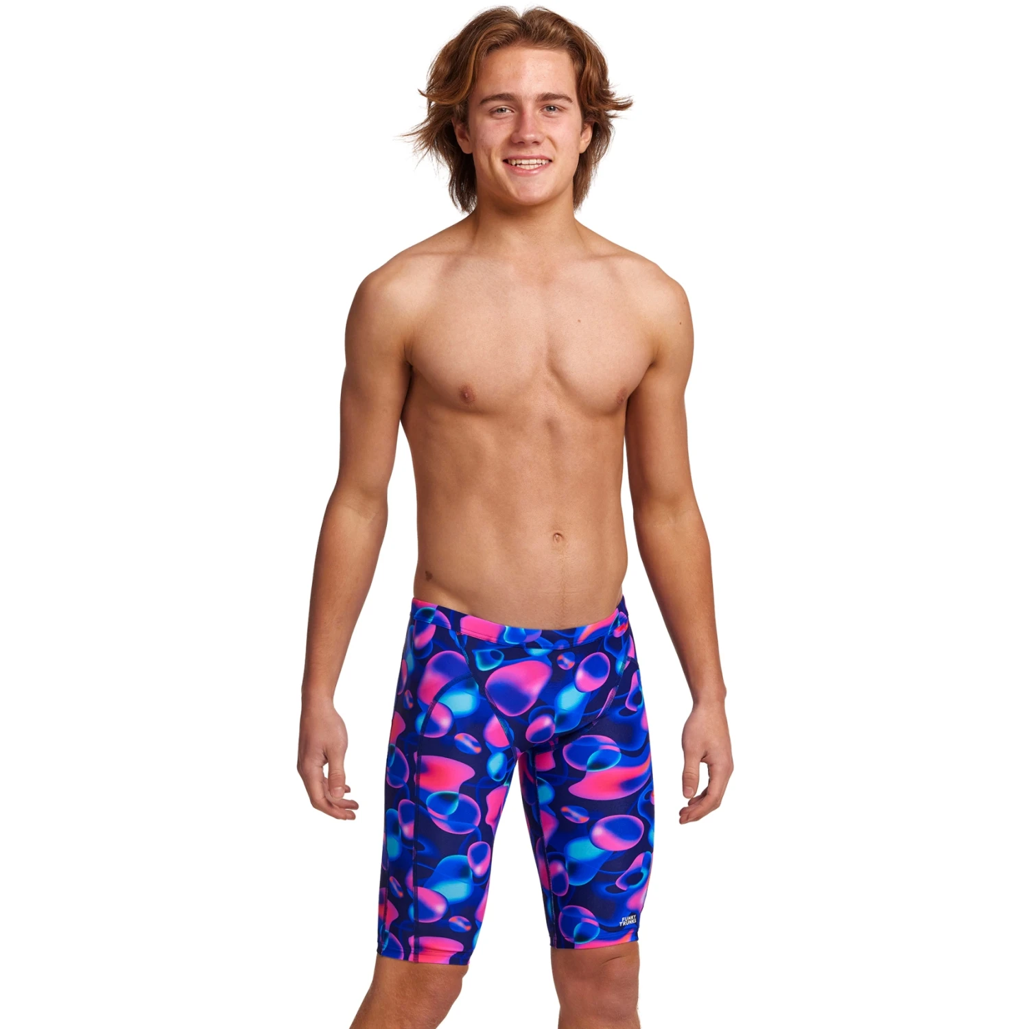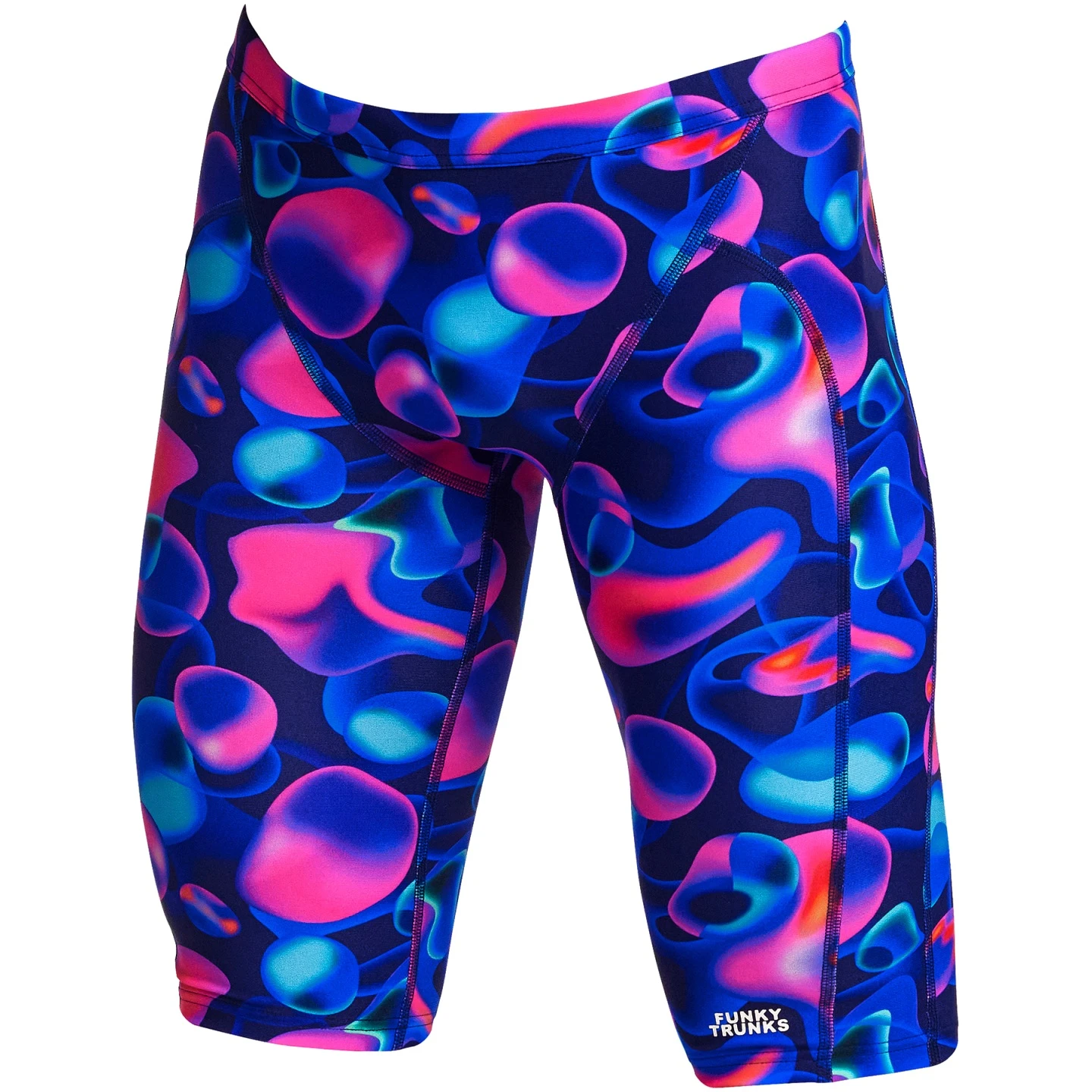 De Funky Trunks Training Jammer bedekt je van heup tot knie en heeft voorgevormde panelen, flatlocknaden en een voering aan de voorkant. Hij heeft een trekkoord om hem op zijn plaats te houden en een brede elastische beenopening en tailleband voor extra comfort rond de heupen en boven de knie. De zwembroek is voorzien van het Funky Trunks-logo met rubberen opdruk voor duurzaamheid, warmte en comfort.